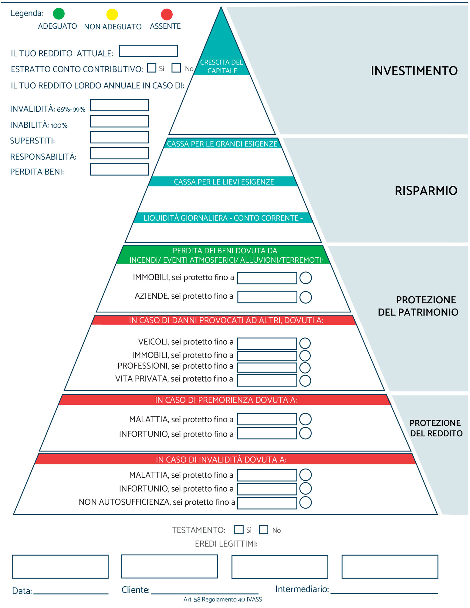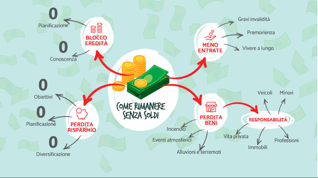 Dall’analisi dei dati raccolti durante l’intervista vengono individuati i VERI rischi in grado di azzerare le entrate mensili, i risparmi, il patrimonio e quindi compromettere il tuo futuro.